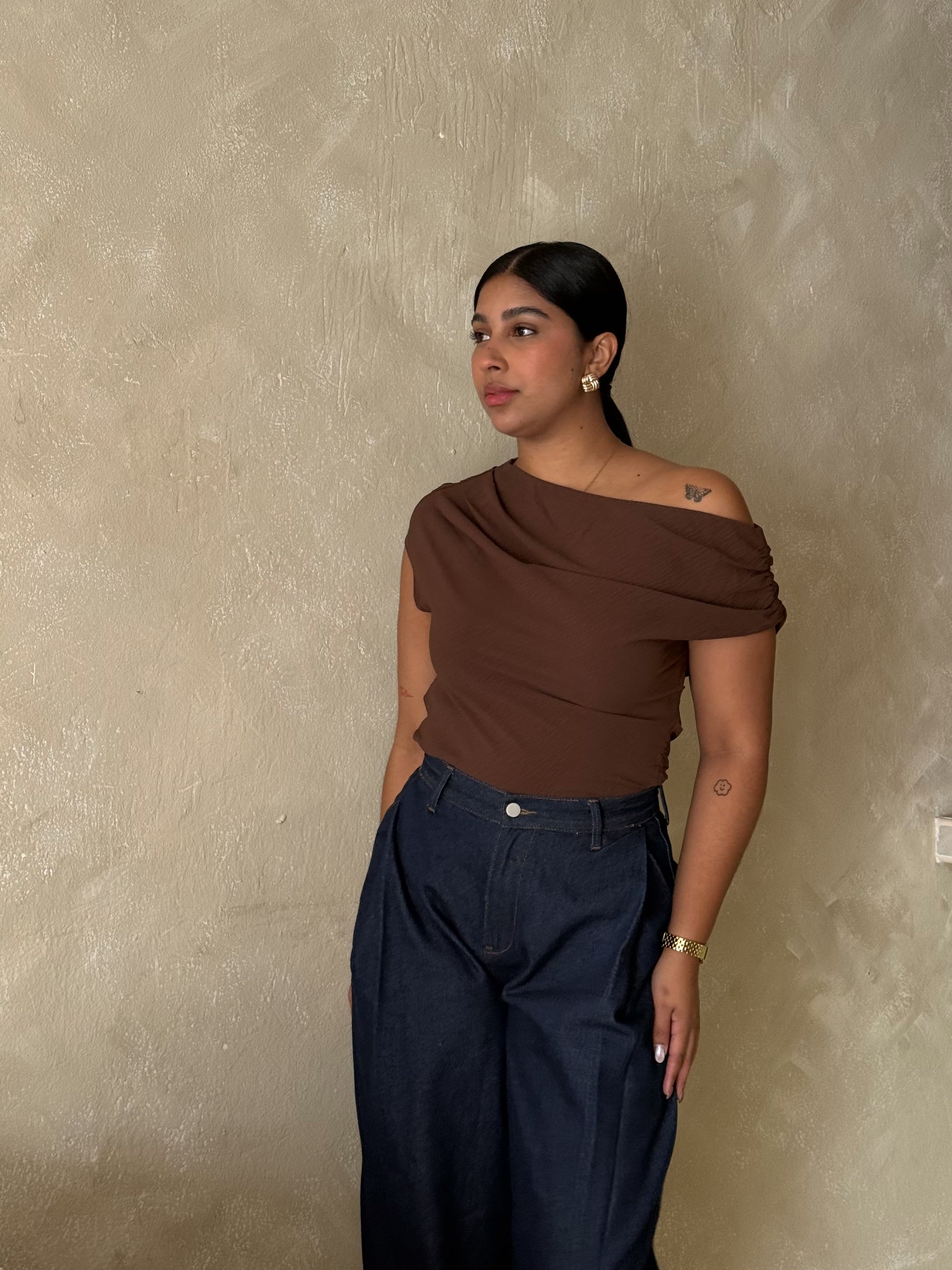 El color cocoa aporta calidez y elegancia sin dejar de ser fácil de combinar — funciona con denim, blanco, negro o tonos neutros. Ese top que repites porque siempre se ve bien.