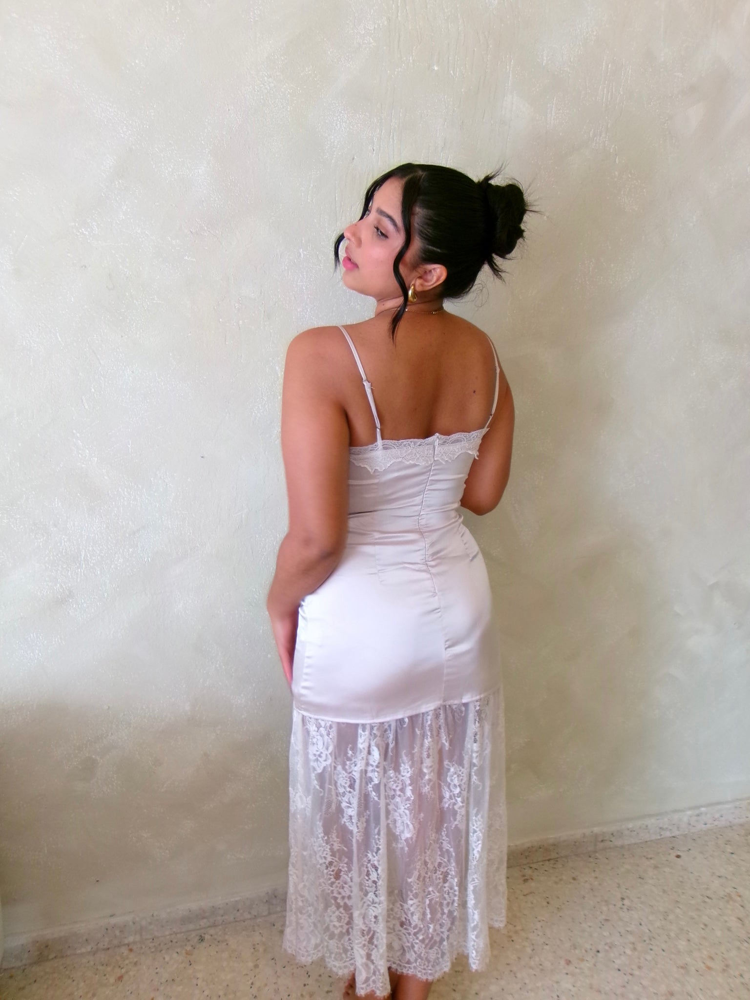 Confeccionado en satín suave que abraza la silueta y rematado con una falda de encaje delicado que añade un toque romántico y especial. Los tirantes finos son ajustable y el detalle de lacito al frente lo hace perfecto para ocasiones donde quieras verte femenina y con un glow diferente. Ideal para cenas, fotos especiales o eventos donde un look sutil pero memorable es la meta. Cuenta con spandex, corre al size y lo llevo en M
